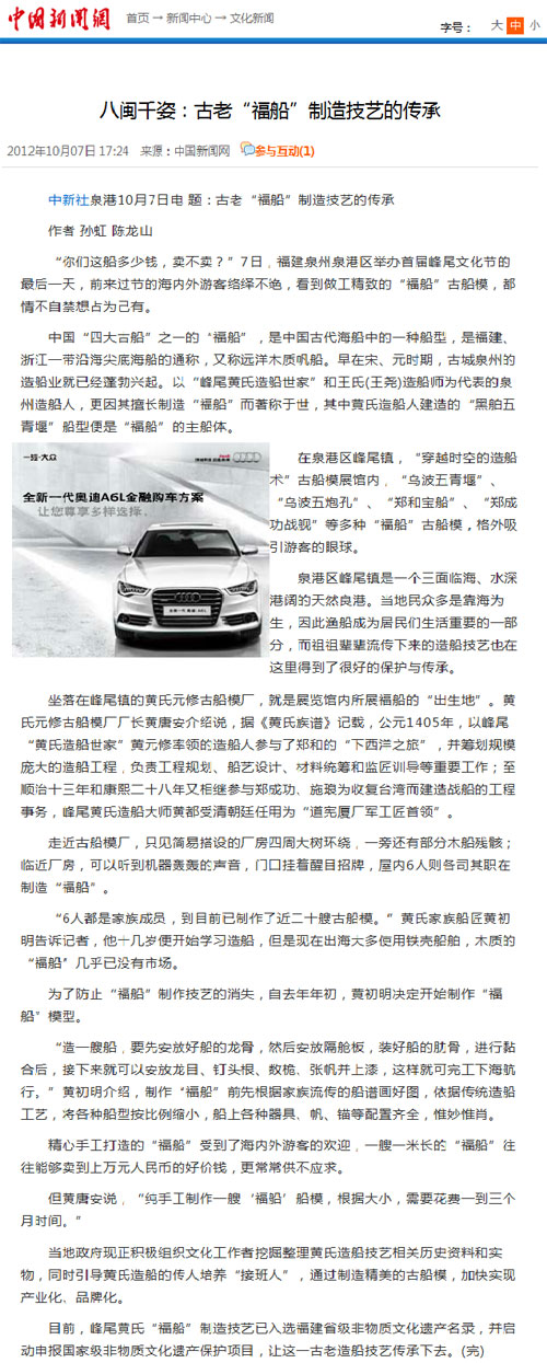 中新社记者2012年10月到“峰尾黄氏元修古船模厂”采访报道!